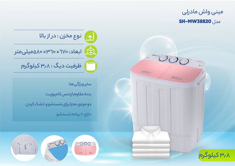 مینی واش مادرلی مدل «SH-MW38820» یک لباسشویی دوقلو کوچک با ظرفیت دیگ 3.8 کیلوگرمی با ابعاد 670 × 360 × 580 میلیمتر و وزن 13 کیلوگرم است. بدنه این مینی واش از جنس کامپوزیت ضدزنگ، ضدپوسیدگی و ضد برقگرفتگی است. دو موتور مجزا جهت عملکرد همزمان سیستم شستشو و خشککن در این مینی واش بهکاررفته است. فیوز ایمنی موجود در دستگاه از آسیب رسیدن به موتور هنگام نوسانات شدید برق جلوگیری میکند. مینی واش مادرلی مدل «SH-MW38820» دارای دو ورودی مجزای آب جهت آبگیری و آبکشی لباسها در مخازن شستشو و خشککن است و امکان آبکشی شرعی نیز در آن فراهمشده است. پایه لرزهگیر این دستگاه مناسب برای استفاده در سطوح شیبدار و سرامیکی است. همچنین وجود چرخ در زیر دستگاه به جابهجایی آسان مینیواش کمک میکند. موتور این محصول از نوع دو دور است که به سمت راست و چپ حرکت میکند. همچنین قابلیت حباب سازی برای شستشوی خوب نیز در نظر گرفته است. علاوه بر این، مجهز به رله حرارتی جهت جلوگیری از آسیب موتور به علت فشار بیشازحد است.